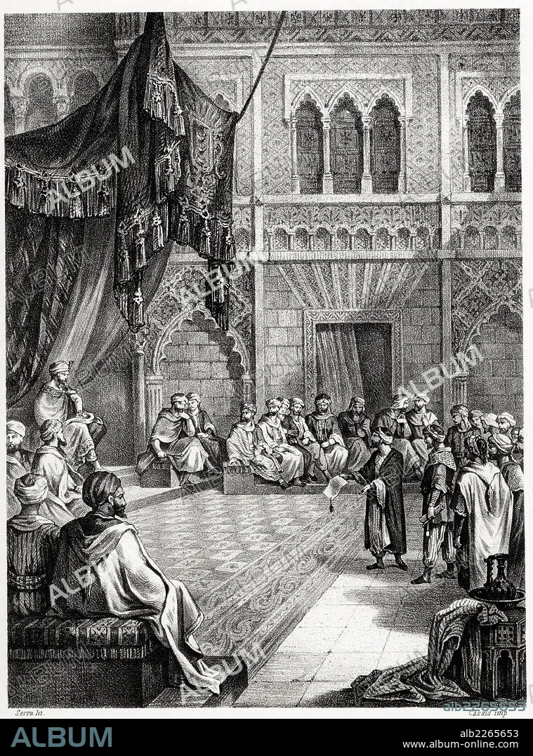 Automatic translation: History of Spain. Recognition of Abderraman III, first emir Almumenin, in the year 912 as successor of his grandfather Abdallach. 1872 engraving