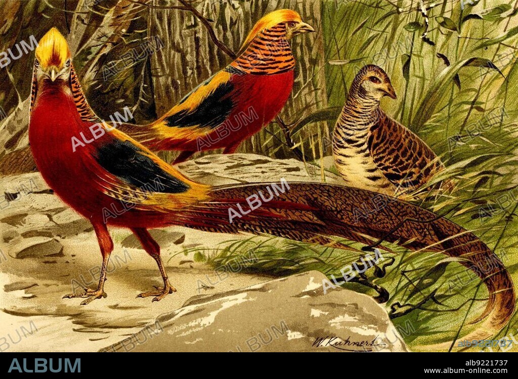 Caption: Bird, Golden Pheasant (Chrysolophus pictus), a species of chicken bird in the pheasant family, Historical, digitally restored reproduction from an 18th century original