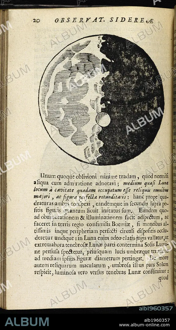 Caption: Drawing of the surface of the moon, showing the dark side, Science. Author Galileo Galilei,