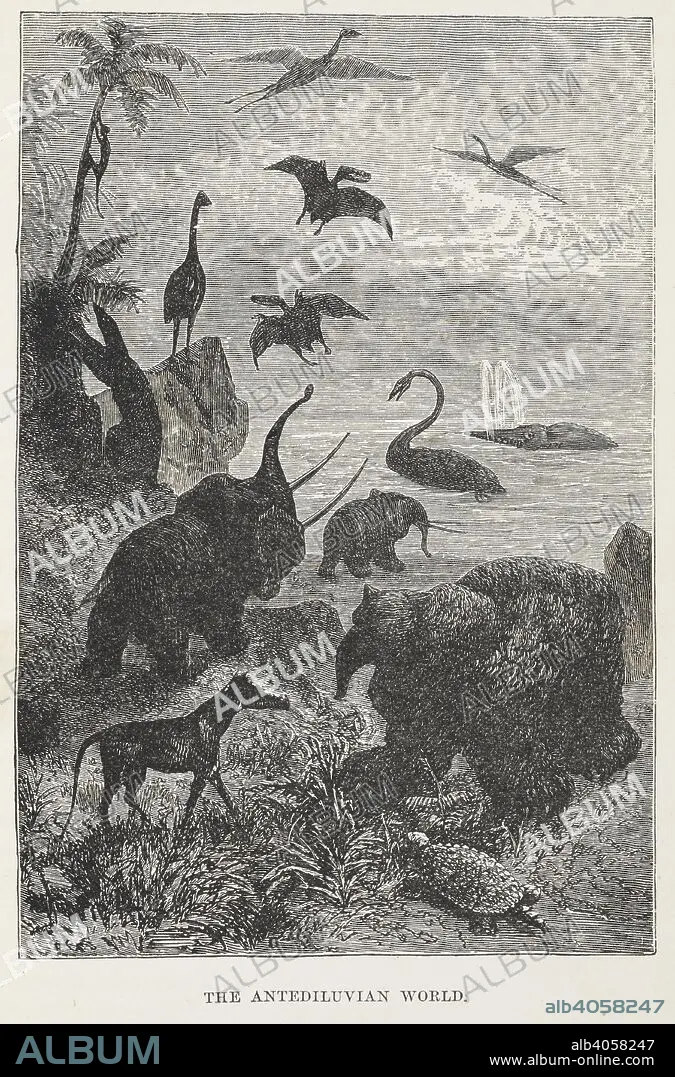 Caption: "The Antediluvian world". Illustration showing prehistoric animals. A Journey to the Centre of the Earth New edition With illustrations, etc. Griffith & Farran: London & Sydney, [1891.]. Source: 012548.eee.6 opposite 244. Language: English.