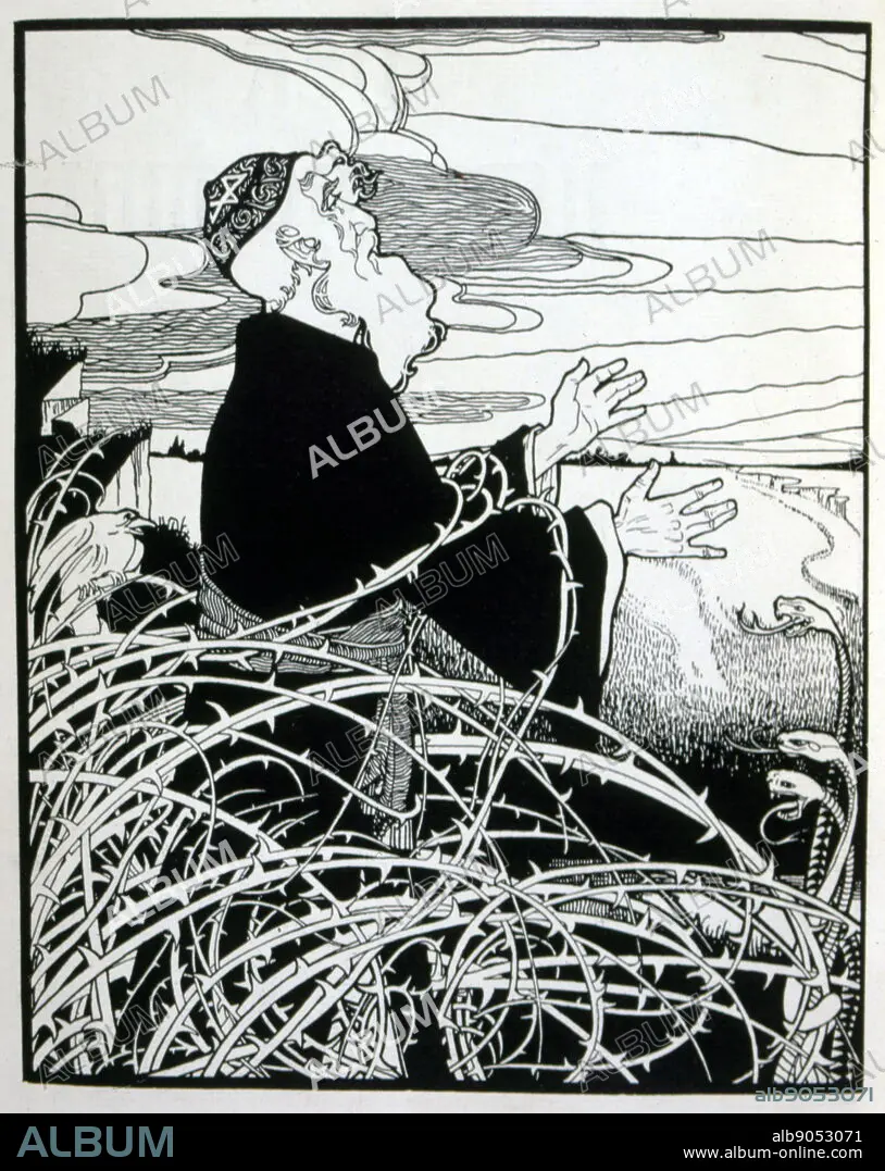 Illustration from Ephraim Moses Lilien 'Lieder des Ghetto' (songs from the ghetto) 1902, by Morris Rosenfeld (Moshe Jacob Alter) (1862 - 1923); Yiddish poet. Ephraim Moses Lilien (1874-1925), art nouveau illustrator and printmaker, noted for his art on Jewish themes. He is sometimes called the "first Zionist artist.