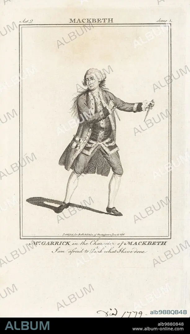 Mr Garrick in the character of Macbeth in William Shakespeare's Macbeth, Drury Lane Theatre, 7 January 1744. In wig, long coat, waistcoat, breeches and buckle shoes, holding daggers. David Garrick, 1717-1779, English actor and theatre manager. Copperplate engraving from John Bell's Edition of Shakespeare, London, January 18th, 1776.