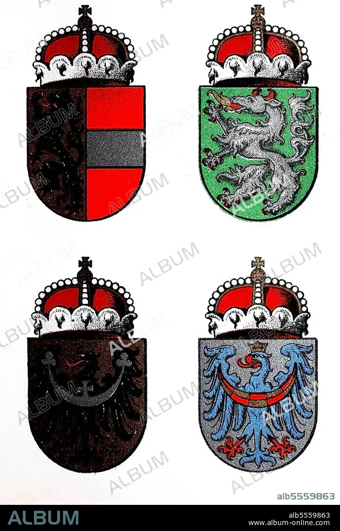 Caption: Wappen der österreichisch-ungarischen Kronländer: Salzburg, Steiermark, Schlesien, Krain, 1890, digital restaurierte Reproduktion einer Originalvorlage aus dem 19. Jahrhundert