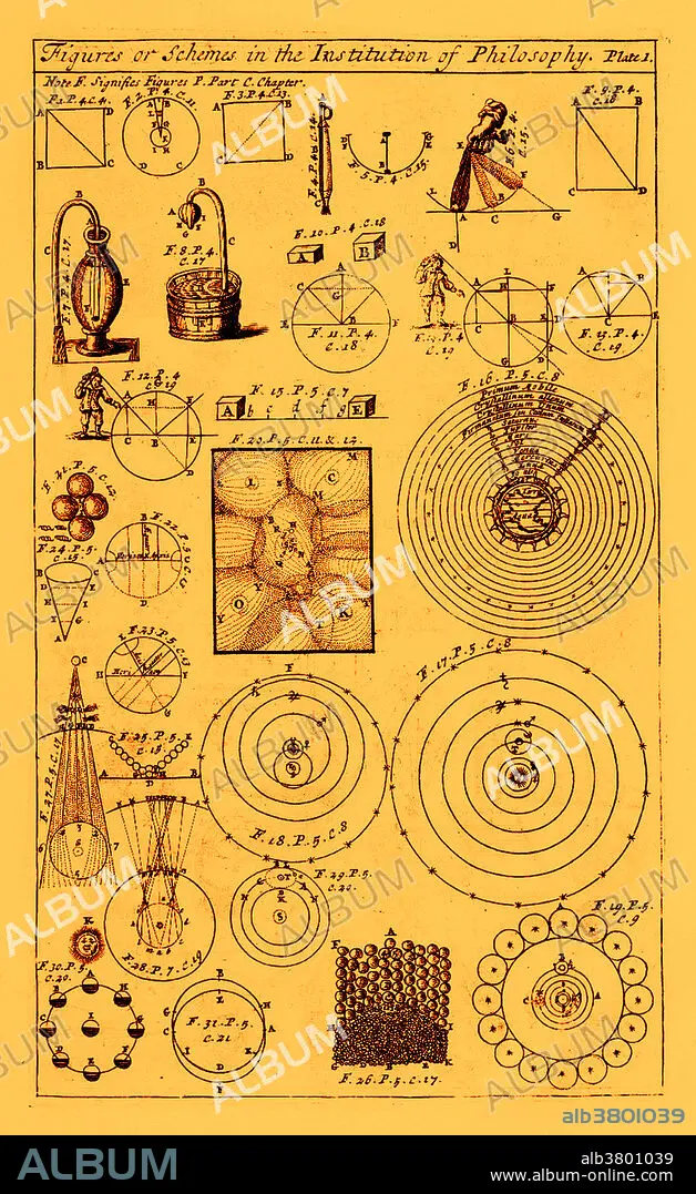 Caption: Captioned: An entire body of philosophy, according to the principles of the famous Renate Des Cartes: in three books, written originally in Latin by the learned Anthony Le Grand; now carefully translated from the last corrections, alterations, and large additions of the author, never yet published; the whole work illustrated with almost an hundred sculptures designed, drawn and engraved historically by good artists, published 1699. The plates are variously signed by Kip, Gucht, Lens, and Freman. Rene Descartes (March 31, 1596 - February 11, 1650) was a French mathematician, philosopher and physiologist. Living on his modest inherited wealth, Descartes travelled, studied, wrote, and served as a soldier in Holland, Bohemia and Hungary. He created analytical geometry, which translates geometrical problems into algebraic form so that algebraic methods can be applied to their solution. Conversely he applied geometry to algebra. He propounded Cartesian