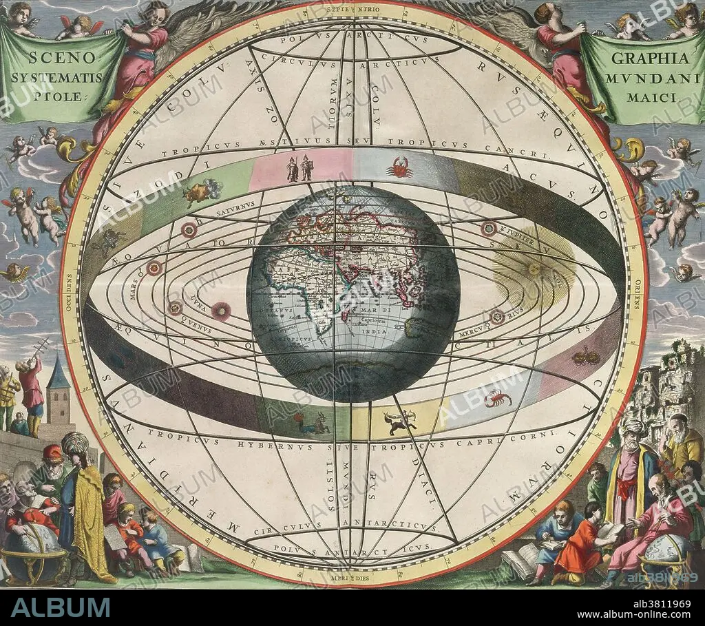 Caption: Scenographia Systematis Mvndani Ptolemaici. Scenography of the Ptolemaic cosmography. In astronomy, the geocentric model (also known as geocentrism, or the Ptolemaic system), is the superseded theory that the Earth is the center of the universe, and that all other objects orbit around it. Ptolemy was an Egyptian polymath, who made studies in astrology, astronomy, geography and mathematics. Illustration by Andreas Cellarius (1596-1665) a Dutch-German cartographer, best known for his Harmonia Macrocosmica of 1660, a major star atlas.