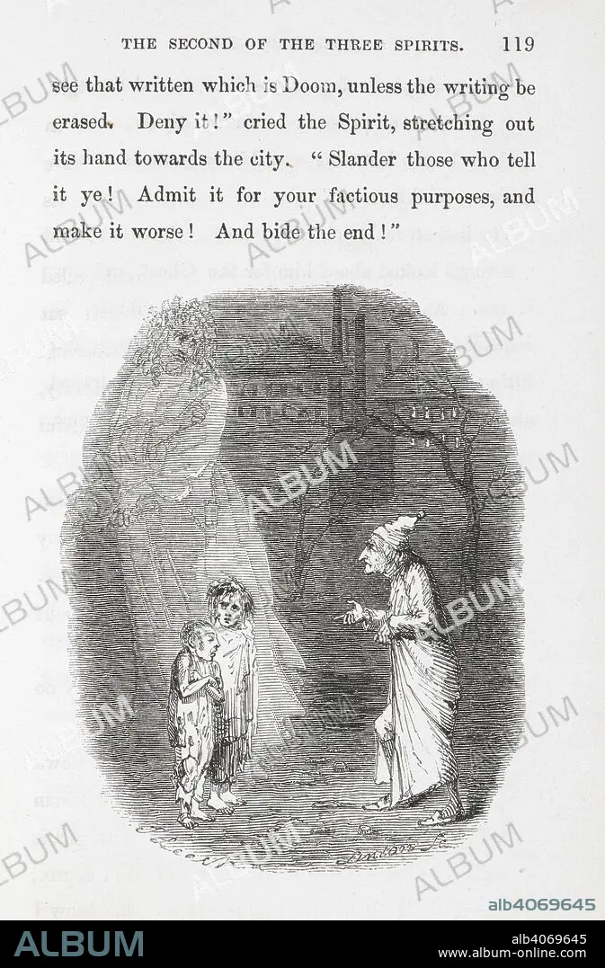 Caption: Ebenezer Scrooge being visited by the 'ghost of christmas present'. The Ghost of Christmas Present shows Scrooge the whole of London celebrating Christmas, including Fred and the Cratchit family. When Scrooge expresses concern for Cratchit's sickly son Tiny Tim, the spirit informs him that the boy will die unless something changes and uses Scrooge's earlier words about "decreasing the surplus population" against him. The spirit then produces two misshapen, sickly children he names Ignorance and Want. When Scrooge asks if they have anyone to care for them, the spirit throws more of Scrooge's own words back in his face: "Are there no prisons, no workhouses?". A Christmas Carol in prose. Being a Ghost-story of Christmas ... With illustrations by John Leech. London : Chapman & Hall, 1843. Source: Dex.293.(1) page 119.