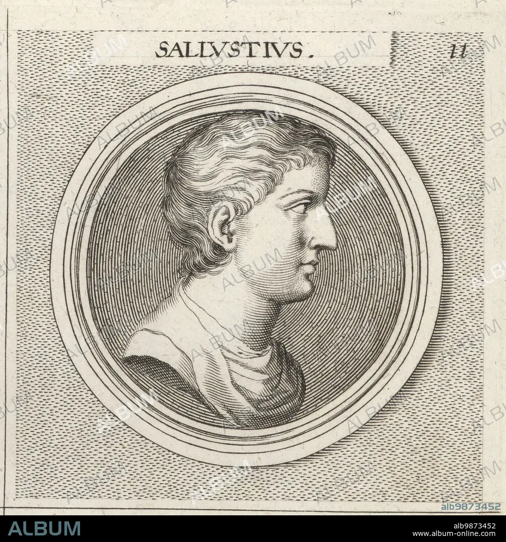 Caption: Sallust or Gaius Sallustius Crispus, Roman historian and politician from an Italian plebeian family, 86-c.35 BC. Sallustius. Copperplate engraving after an illustration by Joachim von Sandrart from his LAcademia Todesca, della Architectura, Scultura & Pittura, oder Teutsche Academie, der Edlen Bau- Bild- und Mahlerey-Kunste, German Academy of Architecture, Sculpture and Painting, Jacob von Sandrart, Nuremberg, 1675.