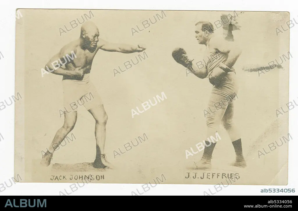 Caption: Fight of the Century between Jack Johnson and James J. Jeffries in Reno, Nevada. The boxers are pictured separately but facing each other. Each man's name is written below his feet. Jeffries is perhaps most famous for being United States "Great White Hope", since the nation expected him to come out of his retirement to beat the African-American boxer Jack Johnson. Johnson, the first Black American world heavyweight boxing champion, won the match and and retained the title.