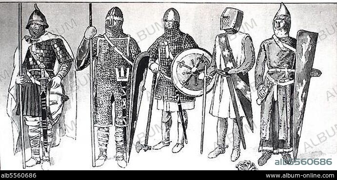 Kleidung, Mode, Ritterkostüme im Mittelalter, von links, Ritter mit Eisenhelm über Lederkappe und Schuppenpanzer in der Karolingerzeit 800, Ritter in Spangenhelm mit Nasenschutz und Kettenhemd Rundschild und Streitaxt, Ritter mit großem Helm, Ringpanzer und Waffenhemd, Ritter in Beckenhaube mit Nasenschutz, Rüstungshemd über Waffenhemd, großem Schild und Horn, digital verbesserte Reproduktion einer Illustration aus dem 19. Jahrhundert