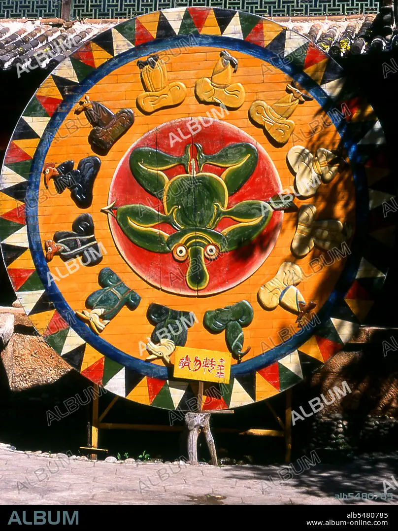Title: Naxi (Dongba) pictograms on a zodiac wheel, Dongba Cultural Research Institute, Lijiang, Yunnan Province.