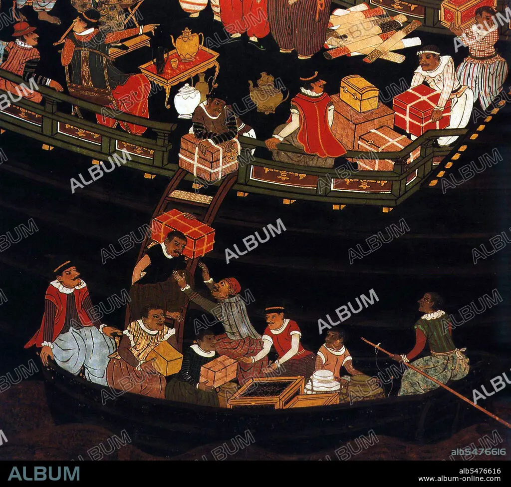 Caption: Kani Naizen (1570 - 1616) was a Japanese painter of the Kani school, particularly known for his screen paintings (byi bu) of Namban (Southern Barbarians, i.e. Europeans). The Nanban trade (Nanban bi eki, 'Southern barbarian trade') or the Nanban trade period (Nanban bi eki jidai, 'Southern barbarian trade period') in Japanese history extends from the arrival of the first Europeans - Portuguese explorers, missionaries and merchants - to Japan in 1543, to their near-total exclusion from the archipelago in 1614, under the promulgation of the 'Sakoku' Seclusion Edicts.