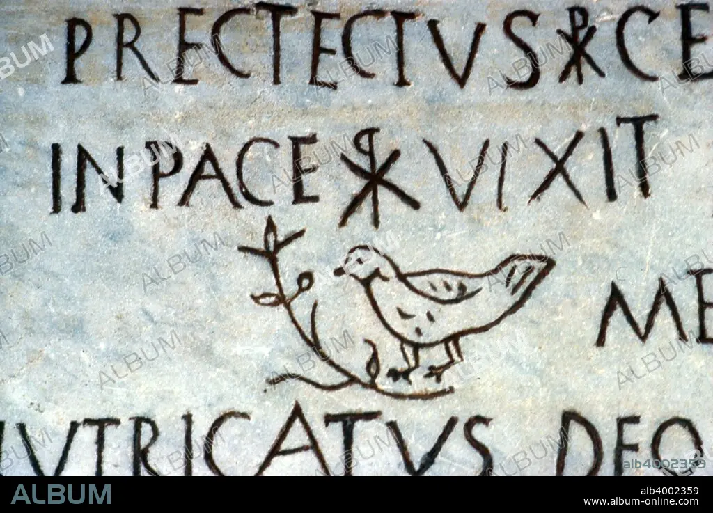 Detail of early Christian funerary inscription from the Catacombs of Rome, c3rd century. The Catacombs of Rome are ancient underground burial chambers under Rome, most famous for Christian burials, either in separate catacombs or mixed together, people of all the Roman religions are buried in them, beginning in the 2nd century AD.