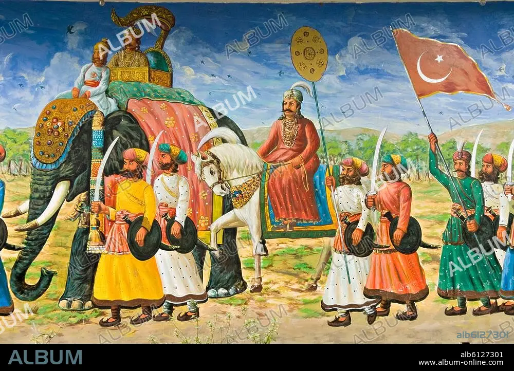 Caption: India / Delhi Sultanate 1206-1526. Conquest of northern India by Muhammad of Ghur 1150-1206. Sultanate founded by Qutbuddin Aybak in 1206.-Conquest of Delhi by the Muslims.-Painting on the wall of a shop in Delhi (detail). Photo, 09.12.2007.