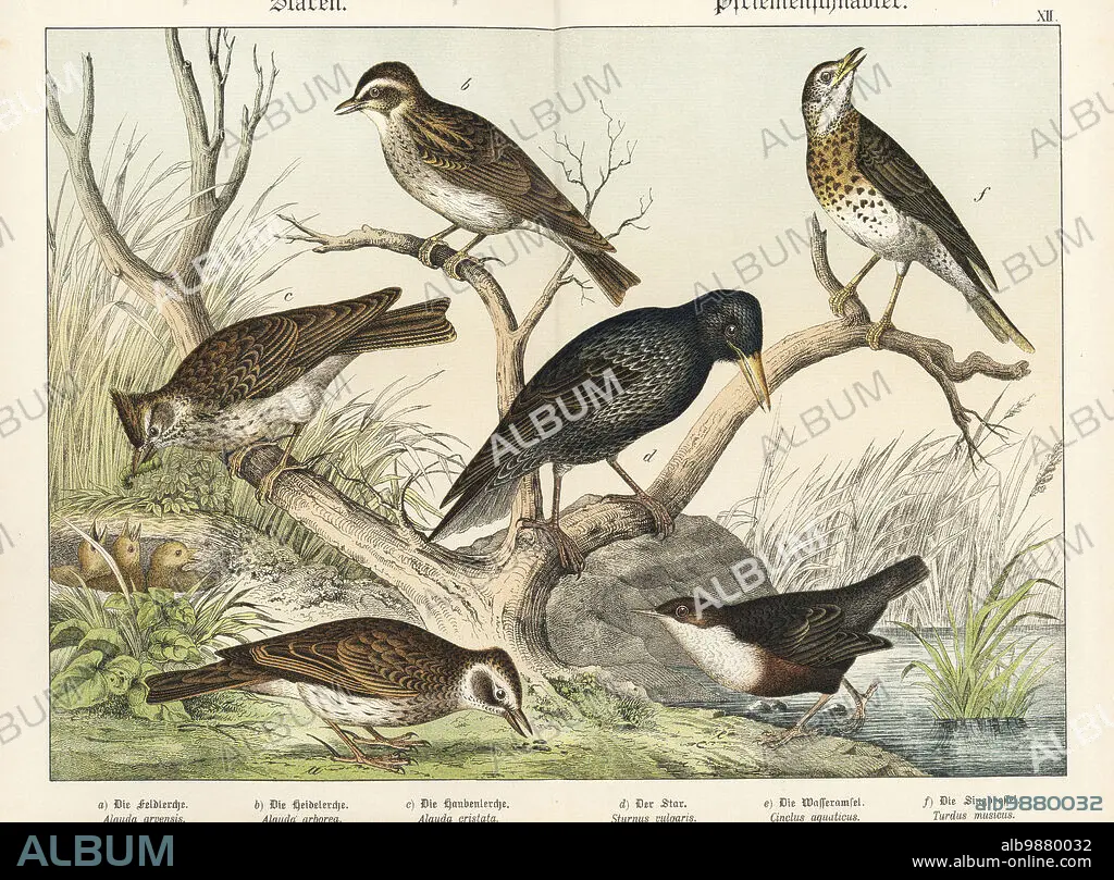 Caption: Eurasian skylark, Alauda arvensis a, wood lark, Lullula arborea b, crested lark feeding young in nest, Galerida cristata c, starling, Sturnus vulgaris d, white-throated dipper, Cinclus cinclus e, and song thrush singing, Turdus philomelos f. Chromolithograph from Gotthilf Heinrich von Schubert's Natural History of the Animal Realms (Naturgeschichte des Tierreichs), Schreiber, Munich, 1886.