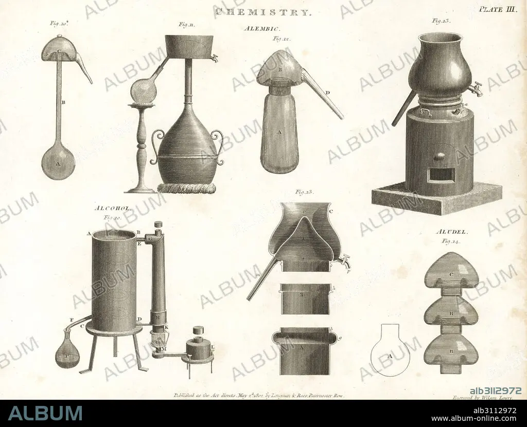 Caption: Alembic still with cucurbit flask and stil-head, alcohol still, and subliming aludel or Hermetic vase. Copperplate engraving by Wilson Lowry from Abraham Rees' Cyclopedia or Universal Dictionary of Arts, Sciences and Literature, Longman, Hurst, Rees, Orme and Brown, London, 1802.