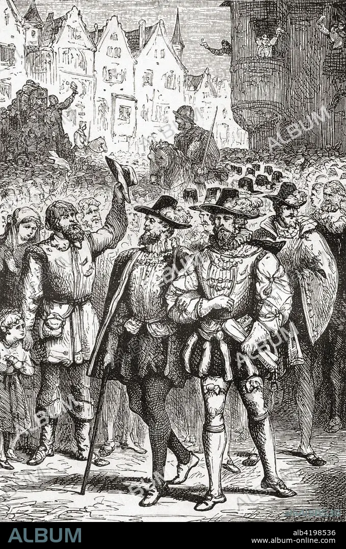 Caption: The procession of the petitioning nobles. A covenant of members of the lesser nobility in the Habsburg Netherlands who came together to submit a petition to the Regent Margaret of Parma on 5 April 1566, to obtain moderation in the Inquisition and the abolition of the laws against heresy. From Ward and Lock's Illustrated History of the World, published c.1882.