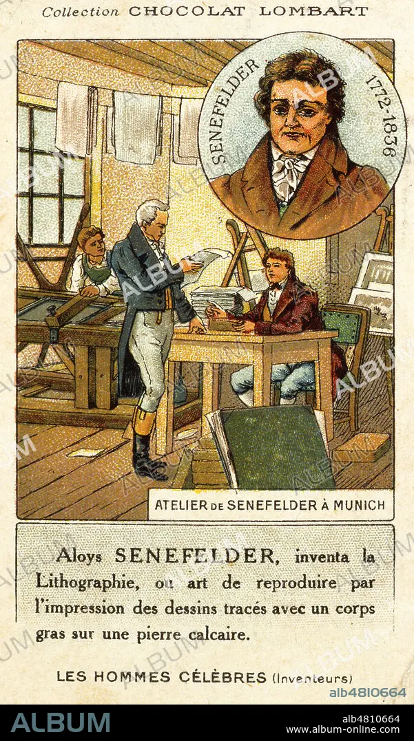 Aloys SENEFELDER (1722-1838) inventa la lithographie ou art de reproduire par l'impression des dessins traces avec un corps gras sur une pierre calcaire, chromo publicitaire Chocolat Lombart. Credit : Collection KHARBINE-TAPABOR.