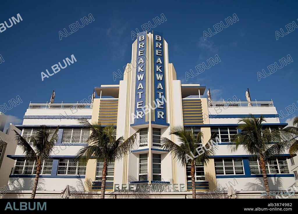 Caption: Breakwater Art Deco hotel on famous Ocean Drive in South Beach, Miami Beach, Florida, USA, North America