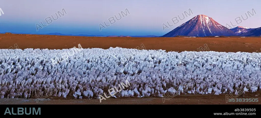 Caption: The spectacular Licancabur Volcano at the border between Chile and Bolivia. Licancabur appears in the morning twilight over an Andean ice field at an altitude of 5000 meters. The ice field in the foreground is a feature of high-altitude Andean plateaus known as ice penitentes. Licancabur reaches to 5920 meters. November 2011.