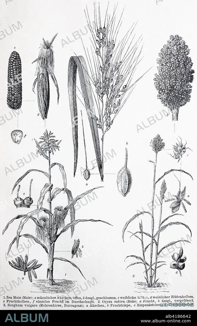 Caption: historical image of various Poaceae or Gramineae, a large and nearly ubiquitous family of monocotyledonous flowering plants known as grasses; Zea Mais, Oryza sativa Rice, Sorghum vulgare, Millet, digital improved reproduction of an original print from the 19th century