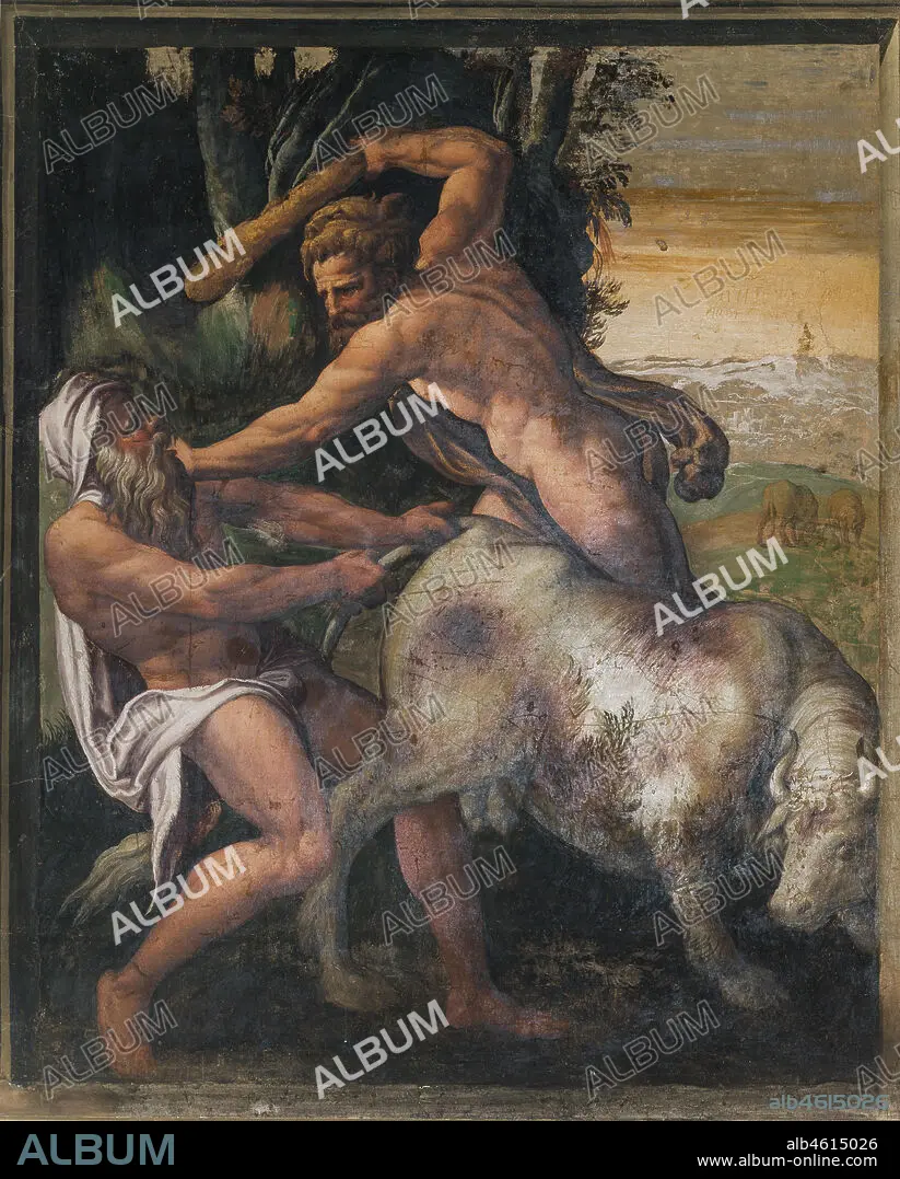 Caption: Parma, Soragna, Rocca Meli Lupi, Yellow Room: "Hercules killing Cacus" detached fresco of the sixteenth century.