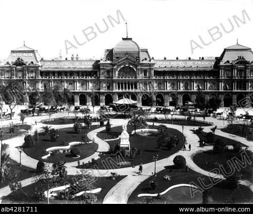 Caption: Santiago. Plaza de Armas (Arms Square). In the background, the "Grand hôtel de France". c.1900. Chile
