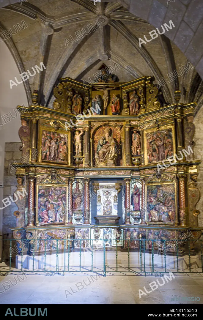 Caption: Romanesque style retable, dating from the late 16th century, Romanesque church, of San Martín de Tours, consecrated in 1156, San Martin de Unx, foral community of Navarra, Spain