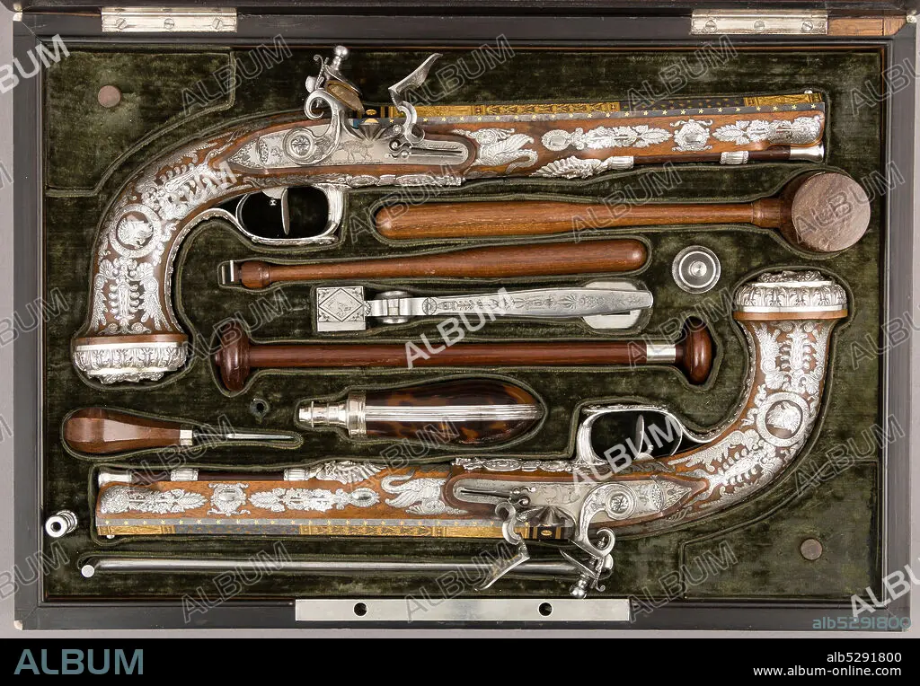 Caption: Cased Pair of Flintlock Pistols with Accessories, French, Paris, ca. 1810.