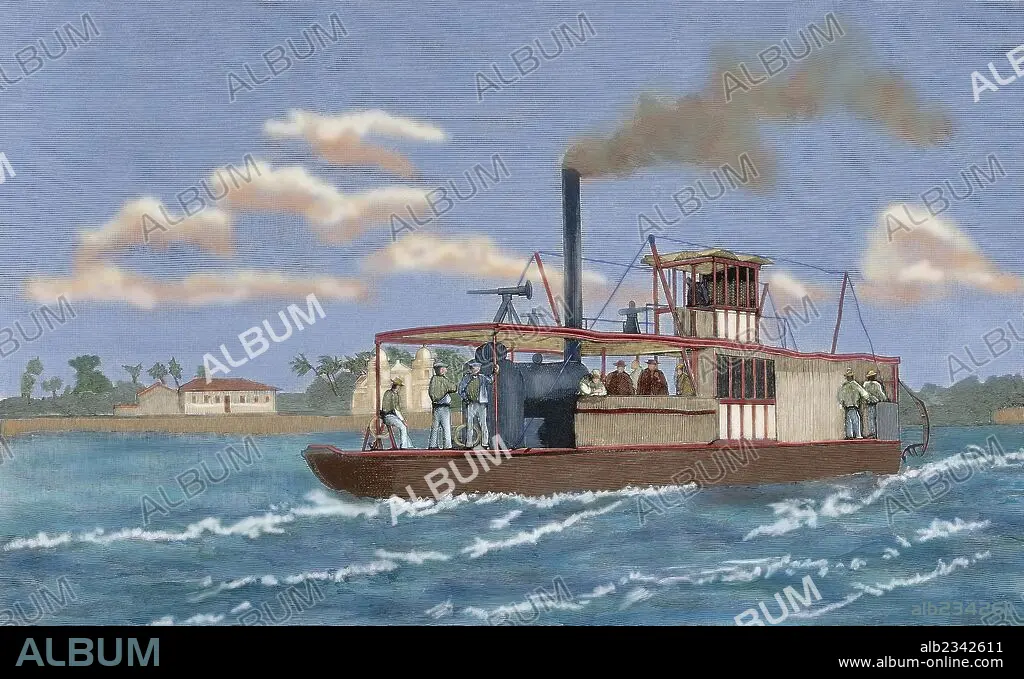 Caption: Portugal. Portuguese gunboat commanded by Major Serpa Pinto, at the mouth of the Zambezi River. Used in the Anglo-Portuguese conflict: struggle of the Portuguese against the Makoldos, aided by the British. Engraving. Colored.