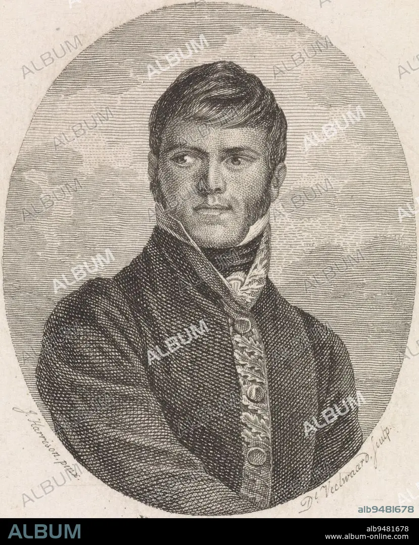 Caption: Portrait of Mexican guerilla leader Francisco Javier Mina, print maker: Daniël Veelwaard (I), (mentioned on object), after: J. Harrison, (mentioned on object), Amsterdam, 1776 - 1851, paper, etching, engraving, h 76 mm × w 75 mm