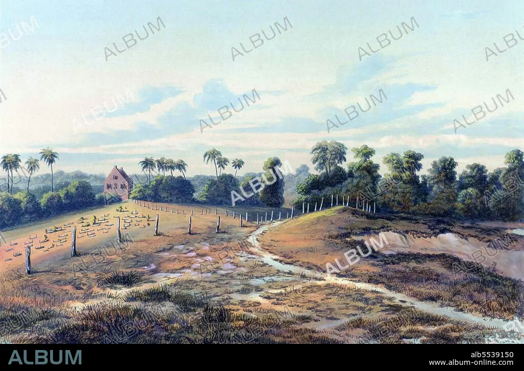 Title: Suriname: 'View of the Synagogue and Cemetery Jodensavanne'. Jacob Eduard van Heemskerck van Beest,1860