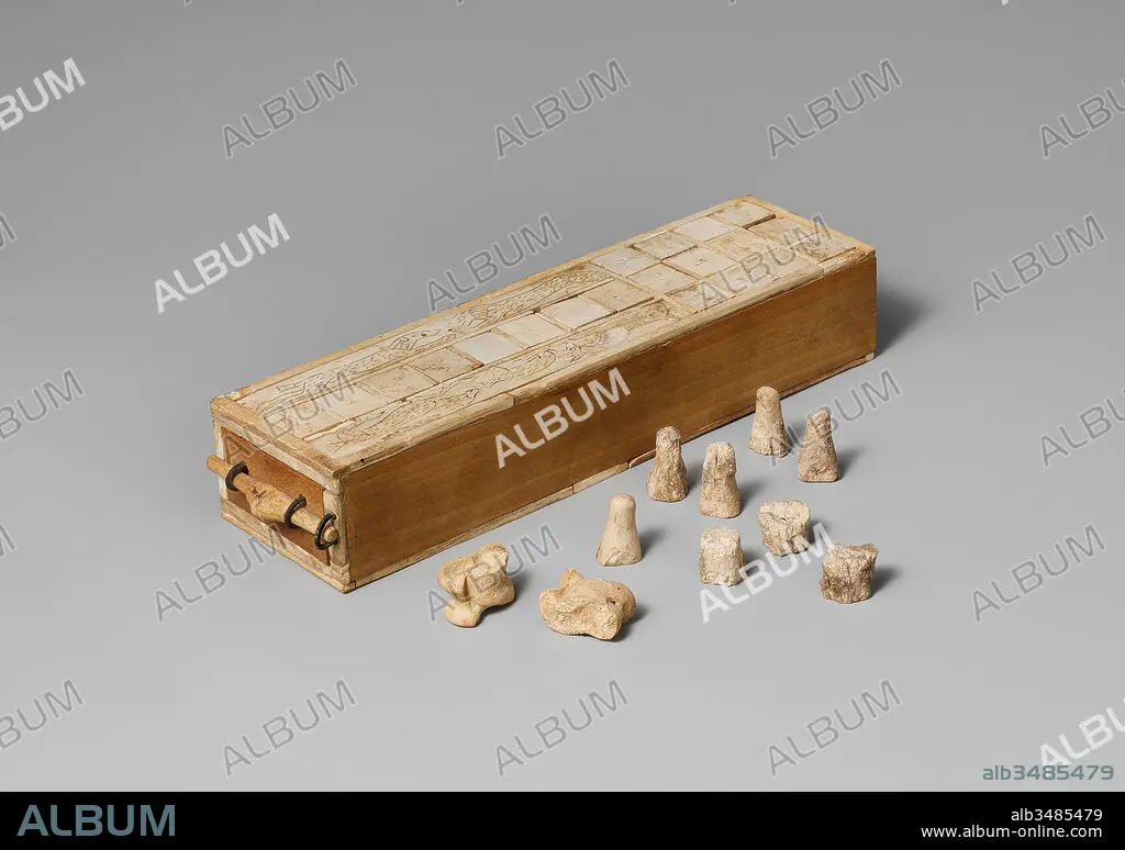 Game Box for Playing Senet and Twenty Squares, Second Intermediate Period–Early New Kingdom, Dynasty 17–Early Dynasty 18, ca. 1635–1458 B.C., From Egypt, Upper Egypt, Thebes, Asasif, Courtyard CC 41, Pit 3, Burial E 3, In coffin, 1915–16, Ivory, copper alloy, modern wood, L. 25 cm (9 13/16 in.); w. 6.7 cm (2 5/8 in.); h. 5 cm (1 15/16 in.), This box has two game boards. The one shown here is for a game called 'twenty squares' or simply 'twenty.' On the opposite side is a board laid out with thirty squares for the game of 'senet.' These were both games in which two players raced each other for position, using knuckle bones as dice to determine each play