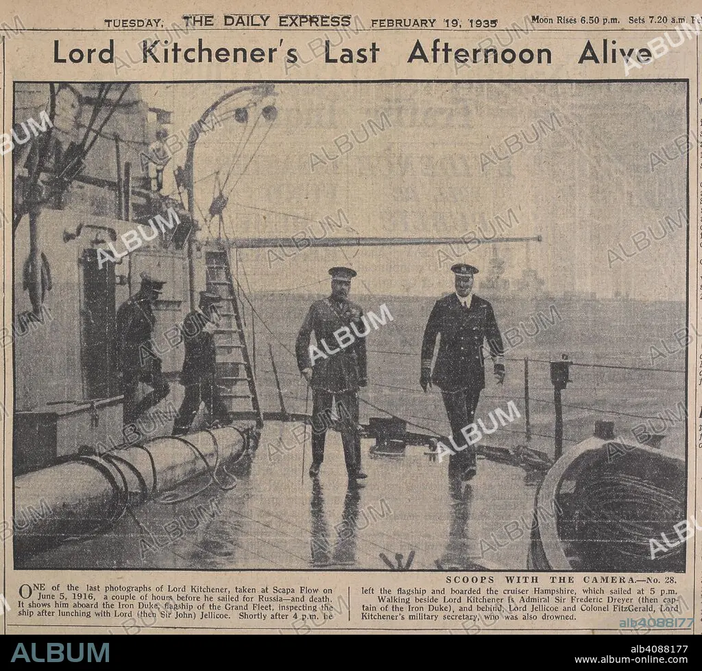 Caption: 'Lord Kitchener's last afternoon alive'. 'One of the last photographs of Lord Kitchener, taken at Scapa Flow on June 5, 1916, a couple of hours before he sailed for Russia - and death. . The Daily Express. London, 1935. Source: The Daily Express February 19, 1935.