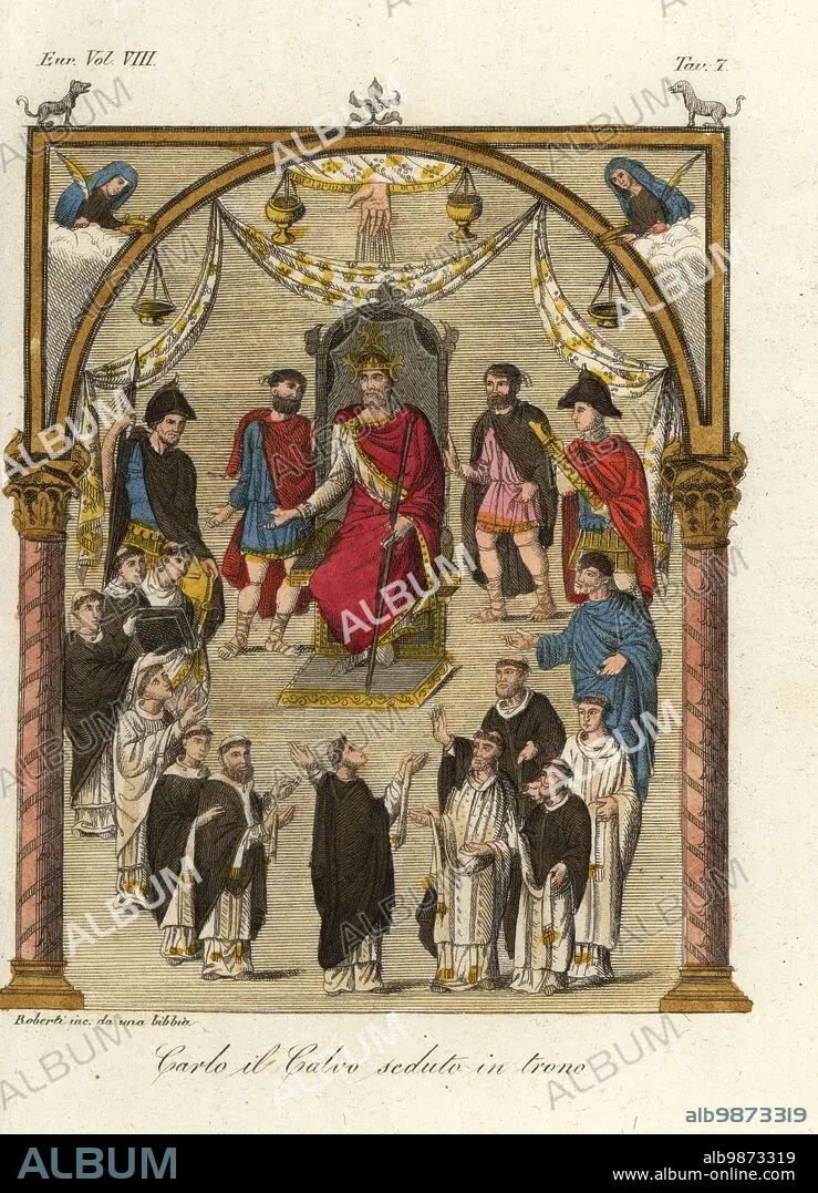 Charles the Bald, Carolingian Emperor, on his throne, 9th century. He wears an extraodinary crown and holds a long rod. Squires on either side hold his great sword, spear and shield. From an illustration in a Bible presented to the king in 869 by the canons of St. Martin of Tours. Carlo il Calvi seduto in trono. Handcoloured copperplate engraving by Roberti from Giulio Ferrarios Costumes Ancient and Modern of the Peoples of the World, Il Costume Antico e Moderno, Florence, 1844.