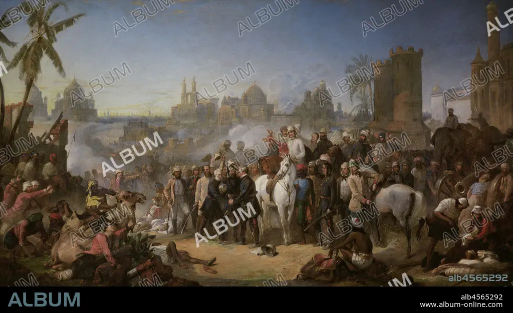 British Empire. Asia. Indian Mutiny, 1857. The Relief of Lucknow. Three central figures depict, from left to right: Sir Henry Havelock (1795-1857), Sir James Outram (1803-1863) and Sir Colin Campbell, Baron Clyde (1792-1863). Painting by Thomas Jones Barker (1815-1882). Oil on canvas (105,4 x 181,3 cm), 1859. National Portrait Gallery. London, England, United Kingdom.