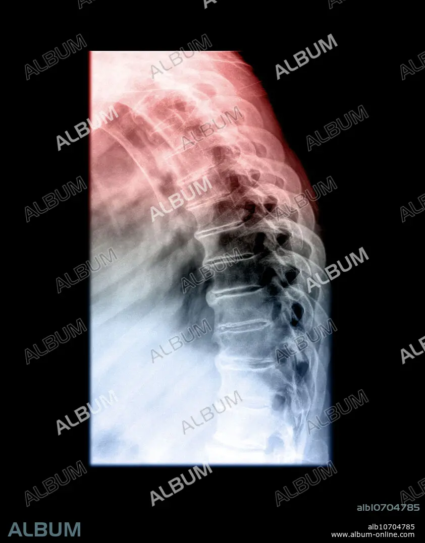 Caption: This enhanced lateral x-ray of the thoracic spine demonstrates multilevel degenerative changes with disc space narrowing and multilevel vertebral margin osteophytes. Osteoporosis is noted.
