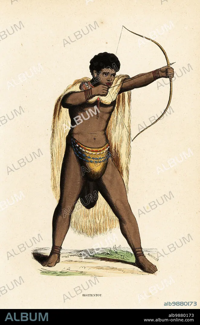 Caption: Khoikhoi man in animal skin cape, beaded loincloth, with bow and arrow. Hottentot. Handcoloured woodcut by Duverger from Auguste Wahlen's Moeurs, Usages et Costumes de tous les Peuples du Monde, (Manners, Customs and Costumes of all the People of the World) Librairie Historique-Artistique, Brussels, 1845. Wahlen was the pseudonym of Jean-Francois-Nicolas Loumyer (1801-1875), a writer and archivist with the Heraldic Department of Belgium.