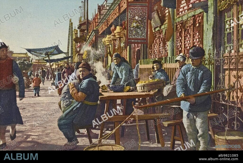 Caption: Street Scene in Beijing with Workers and Traders; c. 1921; China; Historic; digitally restored reproduction from a 19th century original; Asia