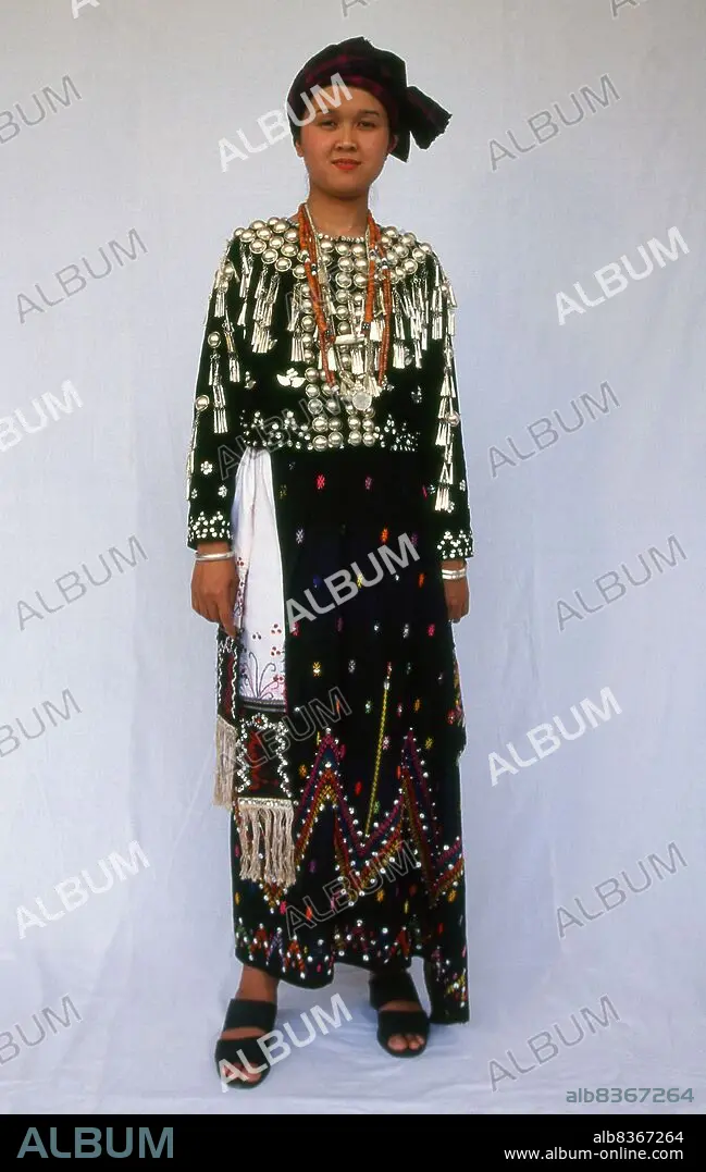 Title: Burma / Myanmar: A Jinghpaw Hkahku woman in traditional costume. There is a great variety of costumes amongst groups considered 'Kachin', Kachin State (1997)