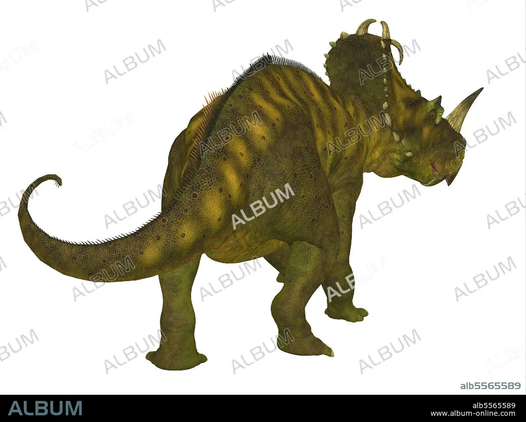 Caption: Centrosaurus dinosaur, rear view. Centrosaurus was a beaked ceratopsian herbivorous dinosaur that lived in Canada during the Cretaceous Period.