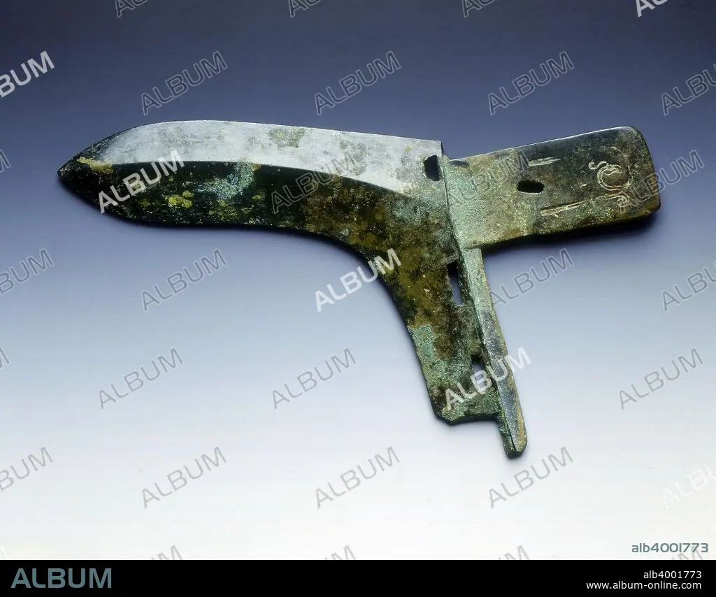 Caption: Bronze ge, Spring and Autumn period, Eastern Zhou dynasty, China, 5th century BC. A bronze ge with good patination. The horizontal flange is incised with stylised phoenixes on both sides. The halberd has rectangular holes adjacent to the vertical flange.