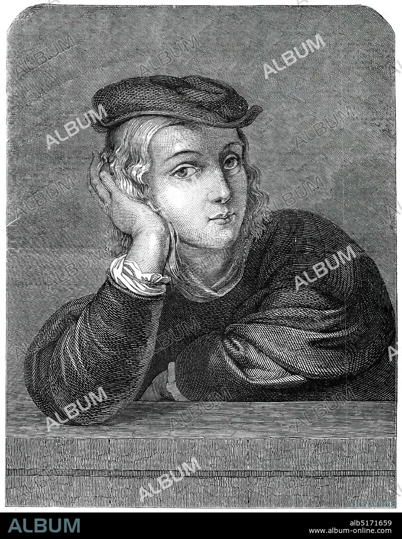 Caption: Raphael at the age of 15 - painted by himself - from the Louvre Gallery, 1845. 'Portrait of a Young Man', (formerly thought to be a self-portrait of Raphael), engraving after a painting by Parmigianino, made c1528-30. 'This superb Portrait of Raphael at 15 years of age, has lately been added to the Gallery of the Louvre, at Paris: its size is about 22 inchss by 17'.From "Illustrated London News", 1845, Vol VII.