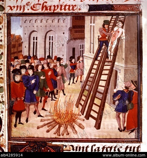 Caption: Hugh the Despenser's torture in Hereford, known as Hugh le Despenser the Younger, in "Chronicles" of Jean Froissart (c.1337 - c.1400) . 1326. EnglandParis, Bibliothèque Nationale