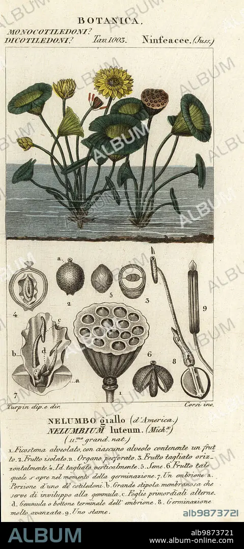 Caption: American lotus, Nelumbo lutea. Nelumbium luteum, Nelumbo giallo dAmerica. Handcoloured copperplate stipple engraving from Antoine Laurent de Jussieu's Dizionario delle Scienze Naturali, Dictionary of Natural Science, Florence, Italy, 1837. Illustration engraved by Corsi, drawn and directed by Pierre Jean-Francois Turpin, and published by Batelli e Figli. Turpin (1775-1840) is considered one of the greatest French botanical illustrators of the 19th century.