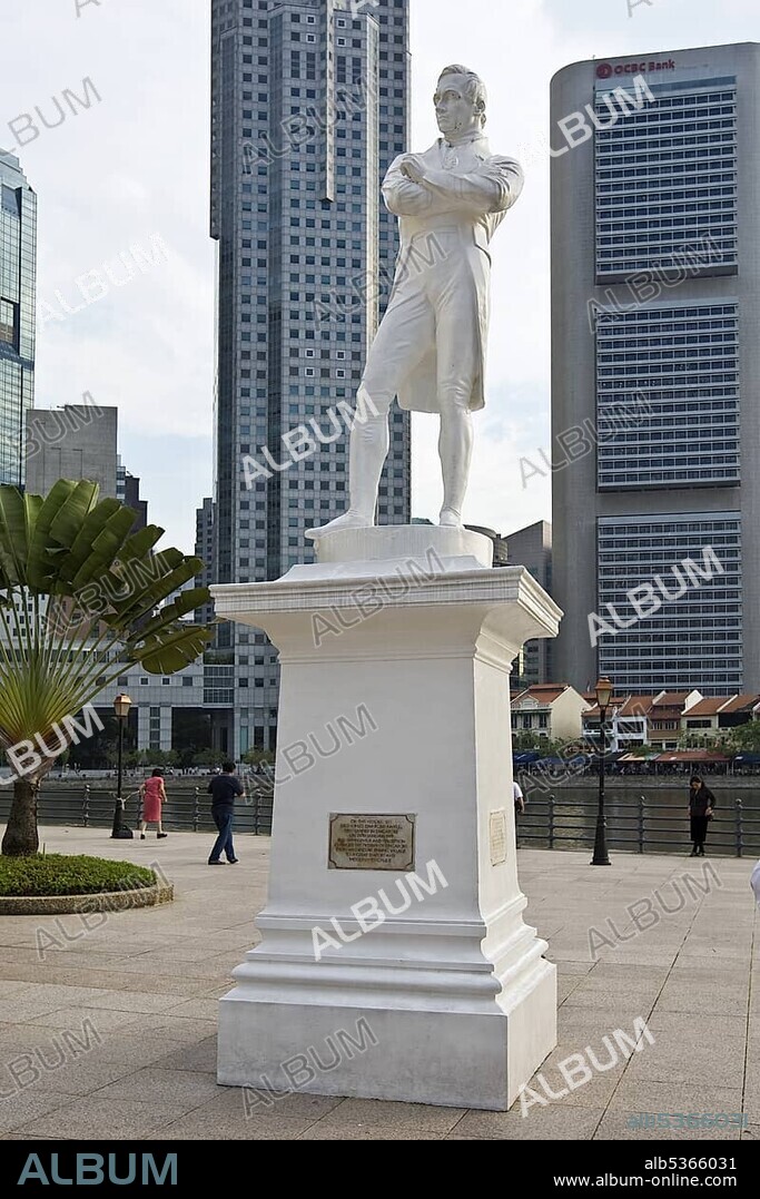 Caption: Statue of Sir Thomas Stamford Raffles, the founder of Singapore, in front of the Singapore River and Financial District, Singapore, Southeast Asia, Asia