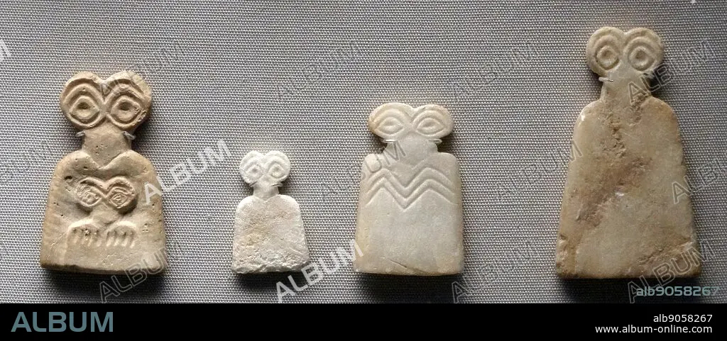 Caption: Sumerian stone head and eye figurines made of glazed faience and clay. From the Eye Temple, Tell Brak, Syria; during the Late Uruk period, 3300-3000 BC