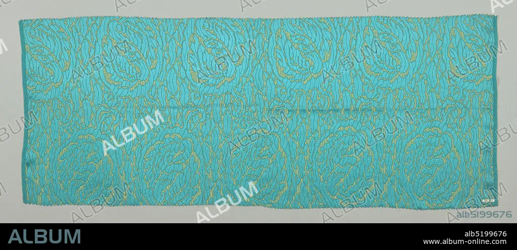 Textile, Duplan Silk Corporation, (Hazleton, Pennsylvania, USA), Medium: silk Technique: compound satin weave, Bright blue-green ground with closely-spaced allover highly conventionalized floral medallion design in satin weave against a ground of plain weave combined with supplementary yellow weft., USA, 1920, woven textiles, Textile