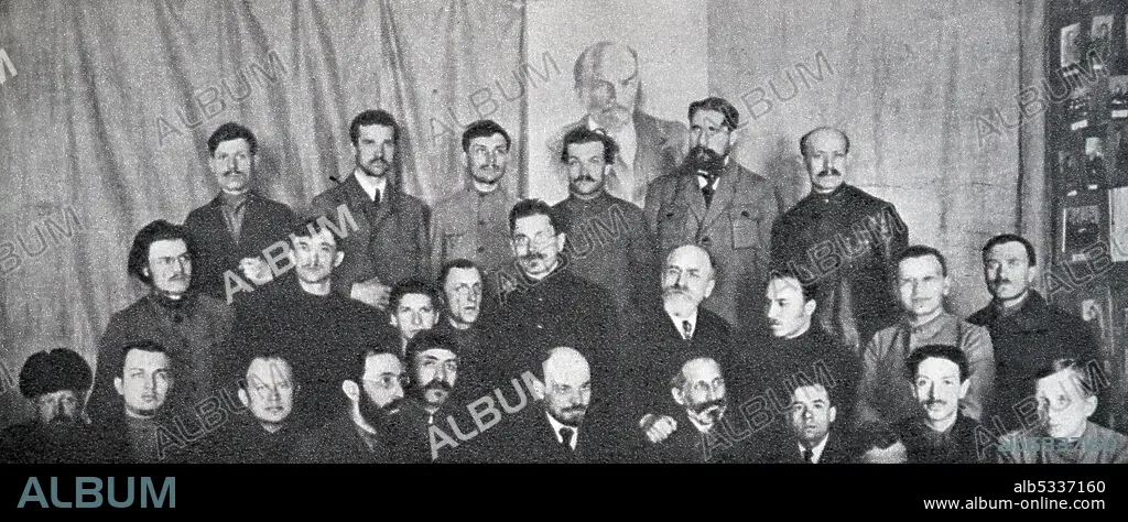 Caption: Vladimir Lenin in the group of delegates to the 9th Congress of the RCP (Bolsheviks).