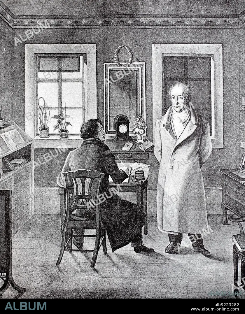 Caption: Johann Wolfgang von Goethe dictates to his secretary in his study, oil painting by J. J. Schneller, 1831, Germany, historical image or illustration, published 1890, digitally improved, Johann Wolfgang von Goethe dictates to his secretary in his study, oil painting by J. Schneller, Gemany, historical image or illustration, published 1890, digitally improved, Europe