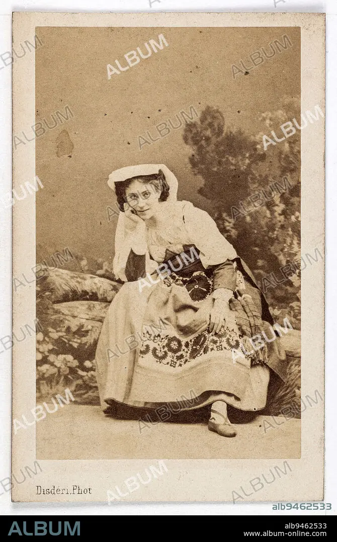 Caption: Portrait of Marie Vernon, dancer at the Opera in 1862, in the role of Fenella, in La Muette de Portici by Daniel-François-Esprit Auber., Disdéri, André-Adolphe-Eugène, Photographer, Between 1860 and 1890, 2nd half of the 19th century, Photography, Graphic arts, Photography, Albumen paper print, Dimensions - Work: Height: 8.5 cm, Width: 5.2 cm, Dimensions: Height: 9.4 cm, Width: 6.1 cm